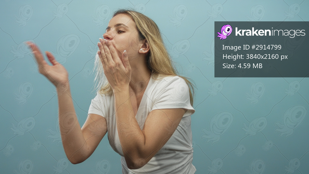Woman blowing a kiss with both hands toward camera in light blue studio, white v neck top and long blonde hair visible; greeting gesture affection.