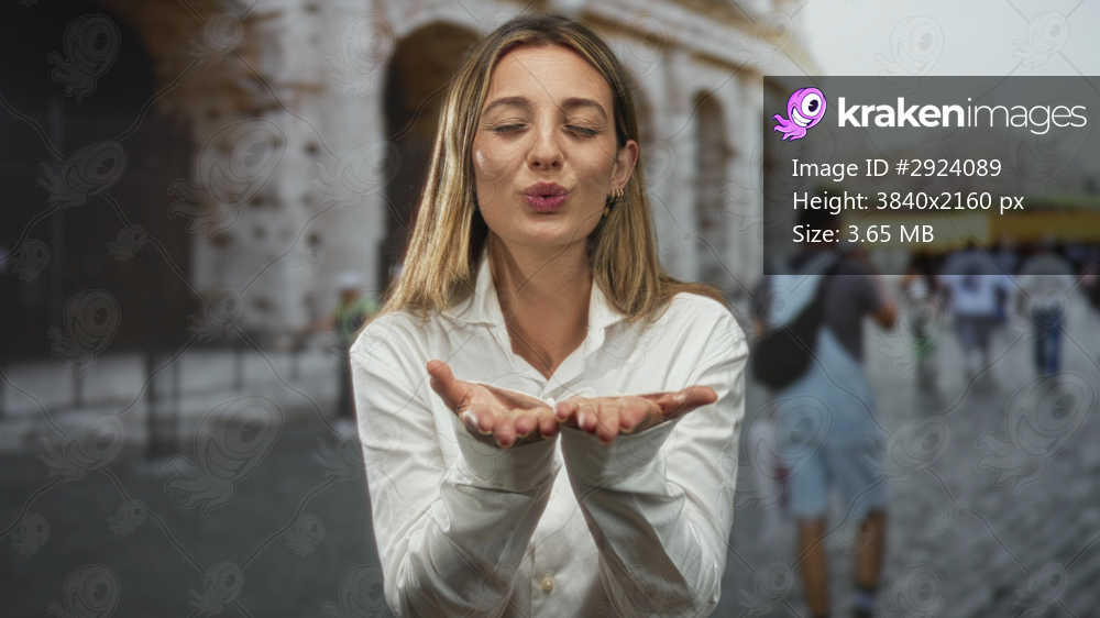 Woman blowing a kiss with cupped hands in front of the colosseum building in rome among tourists; playful romance.