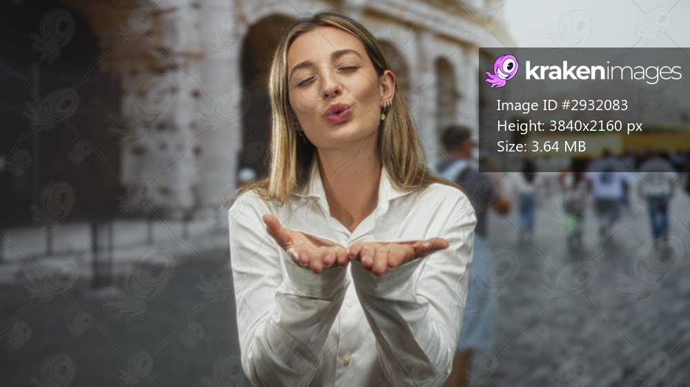 Woman blowing a kiss with cupped hands in front of the colosseum building in rome among tourists; playful romance.