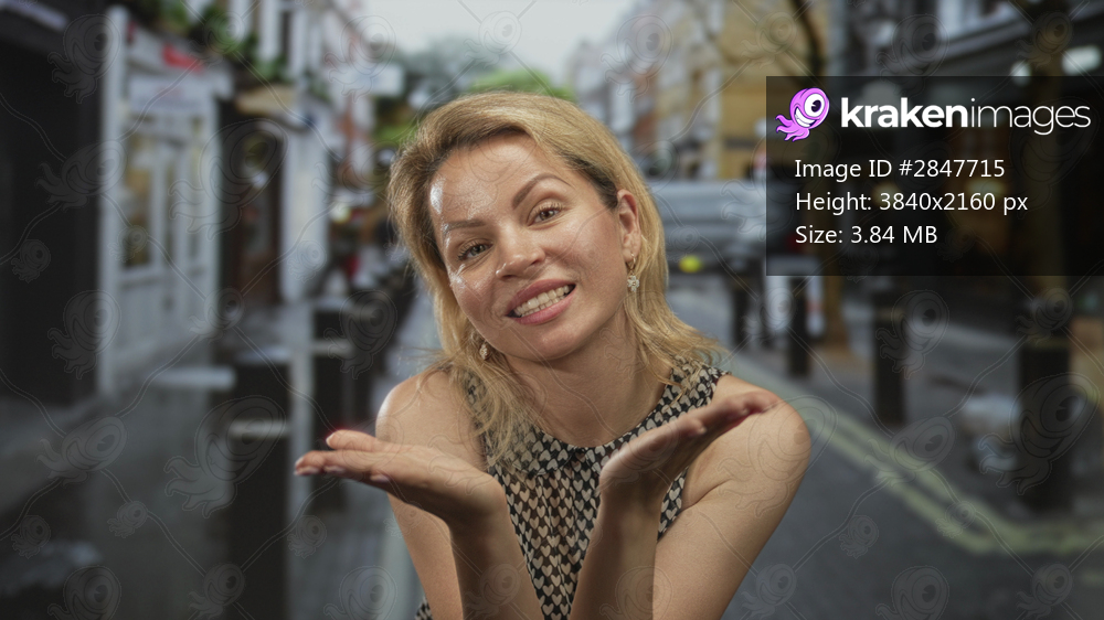 Woman blowing a kiss with hand to lips on a bustling city street, buildings and bollards behind her; affection warmth.
