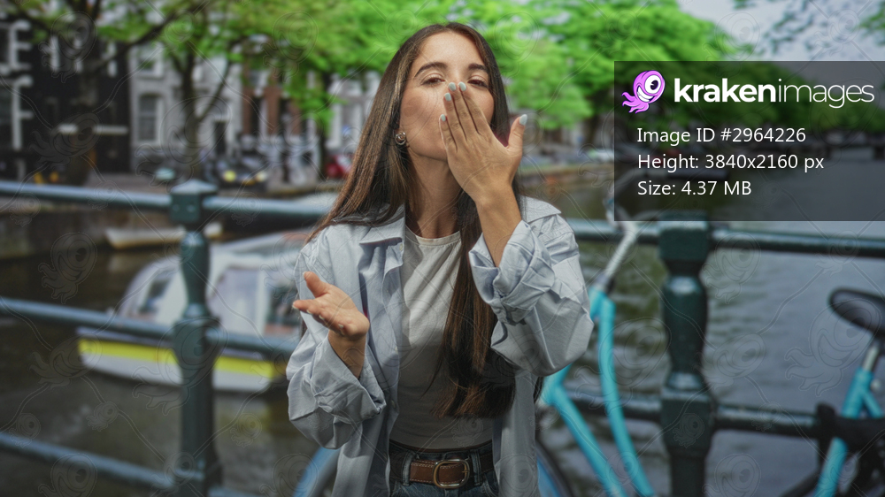 Woman blowing a kiss with hands cupped on a canal bridge in a street, wearing a light shirt and jeans while a bicycle leans nearby; playful travel moment. - Kraken Images