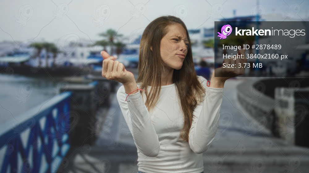 Woman blowing a kiss with hands on a sunny seaside promenade, eyes smiling and lips pursed toward viewer; playful affection.