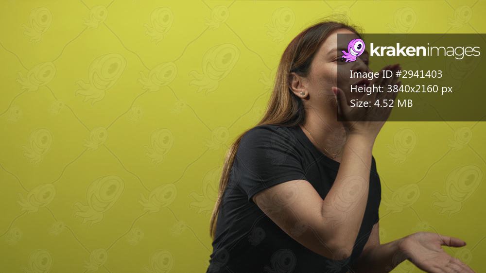 Woman blowing a kiss with hands raised near lips and palms visible in studio with yellow green backdrop; affection.