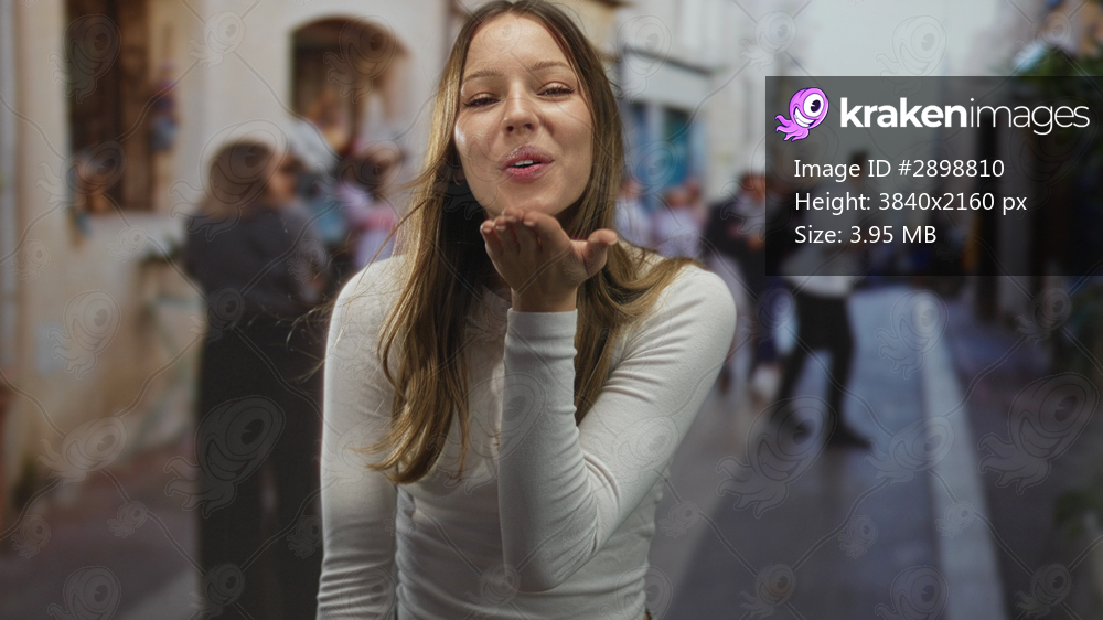 Woman blowing a kiss with hands toward camera on a busy street with blurred pedestrians and buildings in shallow depth of field; affection playfulness. - Kraken Images