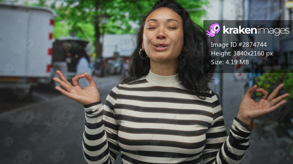 Woman blowing a kiss with hands visible on a city street wearing a black and white striped turtleneck and wooden watch; playful affection.