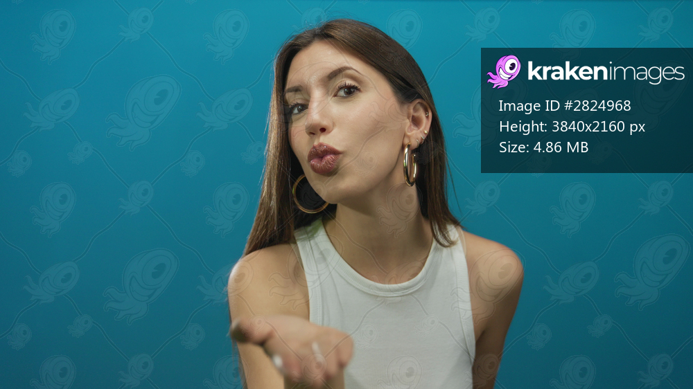 Woman blowing a kiss with outstretched hand in studio, hoop earrings visible, lips pursed; affection.