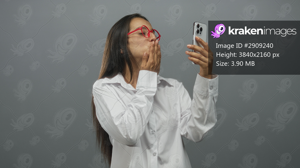 Woman blowing a kiss to smartphone with hand to mouth, wearing red glasses and white shirt in grey studio; affection connection joy.