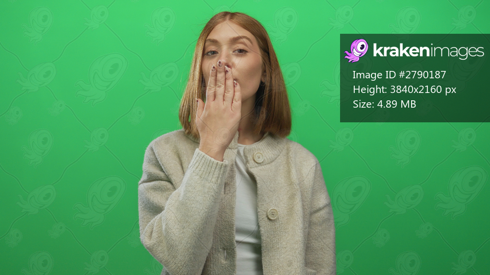 Woman blowing kiss against green background wearing casual beige sweater isolated in studio setting showcasing emotion and expression.