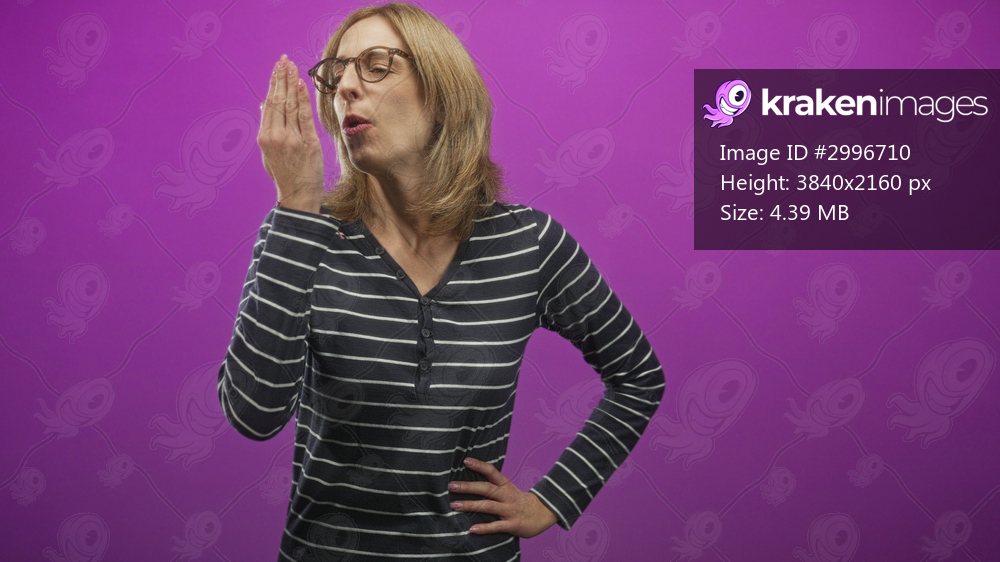 Woman blowing kiss with hand near mouth and other hand on hip, wearing striped top and glasses against purple backdrop in studio; playful affection.