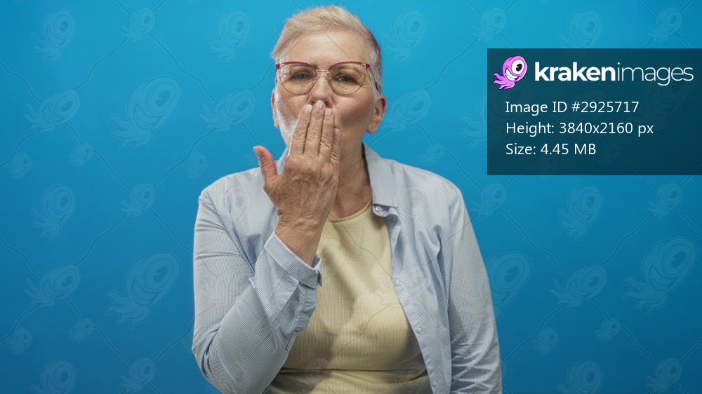 Woman blowing kiss with hand to mouth in blue studio wearing glasses short hair and light shirt; affection closeness connection.
