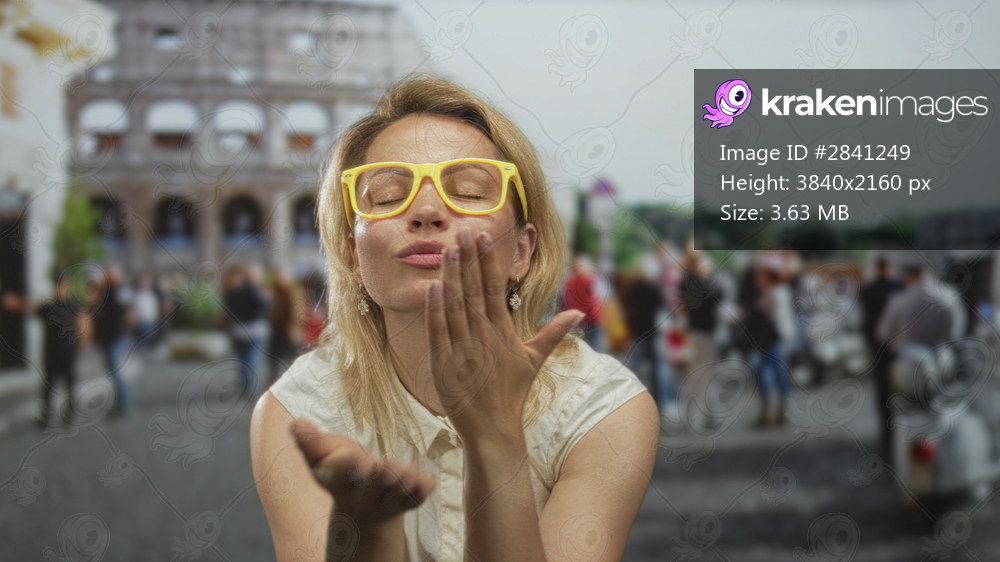 Woman blowing kiss with puckered lips wearing yellow glasses at historic roman coliseum; romance affection.