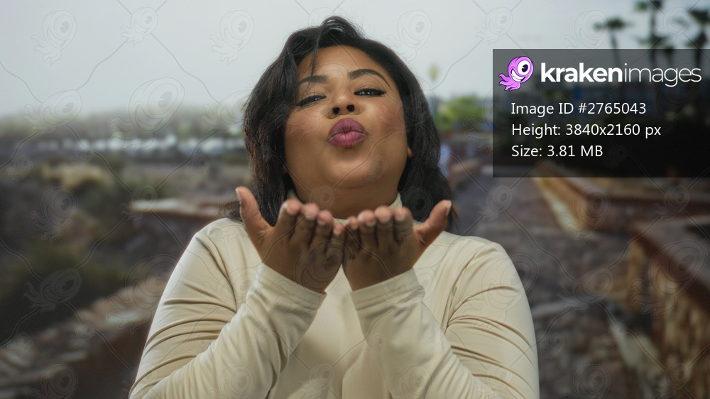 Woman blows a cheerful kiss to the camera outdoors on a city street with a joyful expression, showcasing her plus size beauty with vibrant confidence and playful charm. - Kraken Images