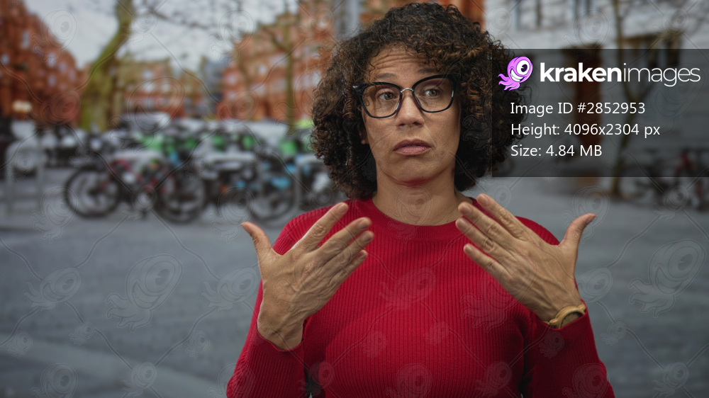 Woman blows air with hands on a city street with parked bicycles and brick buildings, wearing red sweater and glasses; contemplation.