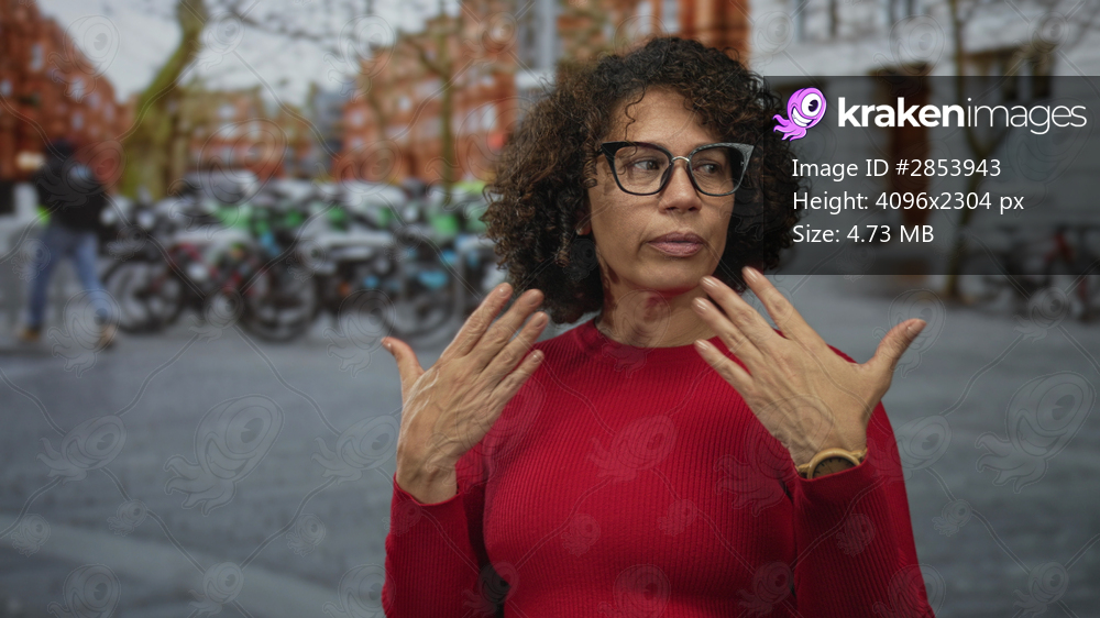 Woman blows air with hands on a city street with parked bicycles and brick buildings, wearing red sweater and glasses; contemplation.