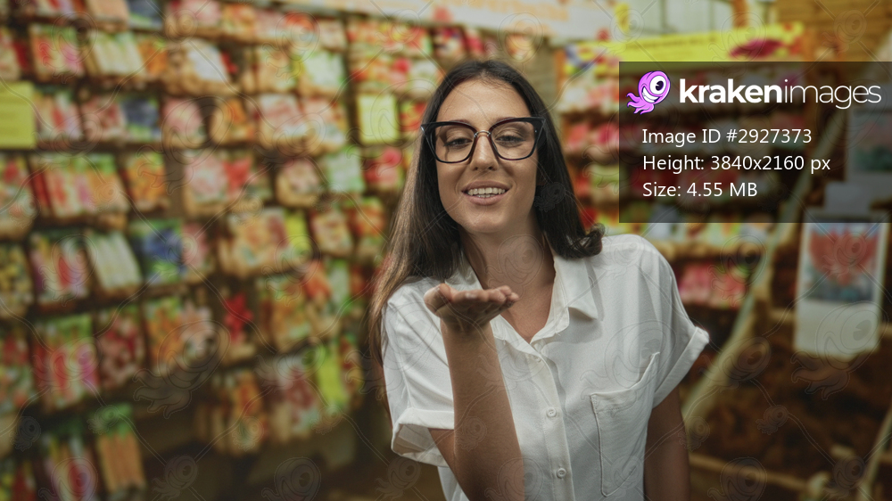 Woman blows kiss with hand in flower shop building, wearing glasses and white shirt, smiling with palm extended; affection kindness.