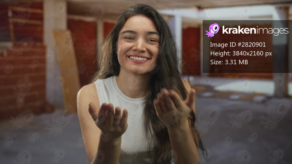 Woman blows kiss with hand to lips inside unfinished building with brick walls and wooden beam columns; affection.