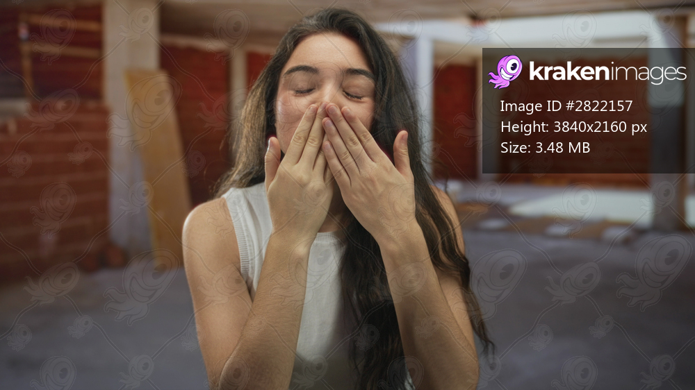 Woman blows kiss with hand to lips inside unfinished building with brick walls and wooden beam columns; affection.