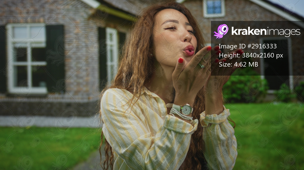 Woman blows kiss with hands at house entrance outdoors, showing red nails and smile; affection gratitude.