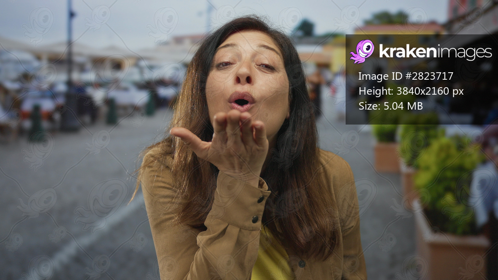 Woman blows kiss showing lips and open hand gesture on busy street lined with cafe tables and potted greenery; greeting warmth affection.