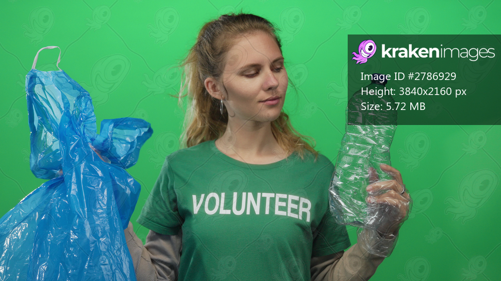 Woman bottle holding studio sequence features a blonde young volunteer handling plastic bag recycling efforts.