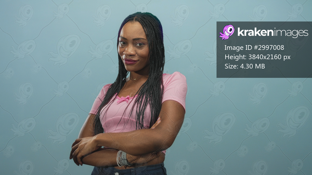 Woman with braided hair and arms crossed, slight smile, wearing pink top and bracelets against studio backdrop; confidence poise.