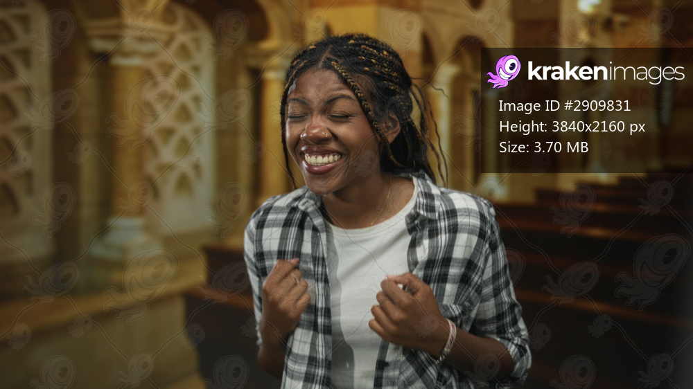 Woman with braided hair and clenched fists to chest wearing plaid shirt, smiling with eyes closed in church building pews visible; joy spiritual gratitude. - Kraken Images
