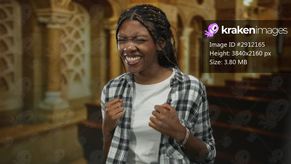 Woman with braided hair and clenched fists to chest wearing plaid shirt, smiling with eyes closed in church building pews visible; joy spiritual gratitude. - Kraken Images