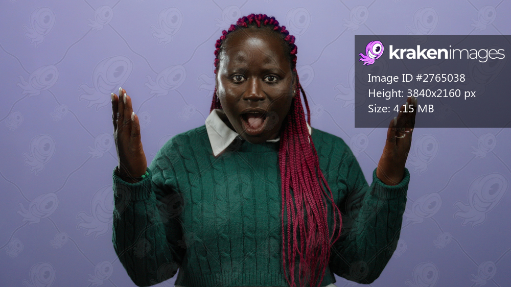 Woman with braided hair energetically uncovers her eyes against a purple background conveying surprise emotion