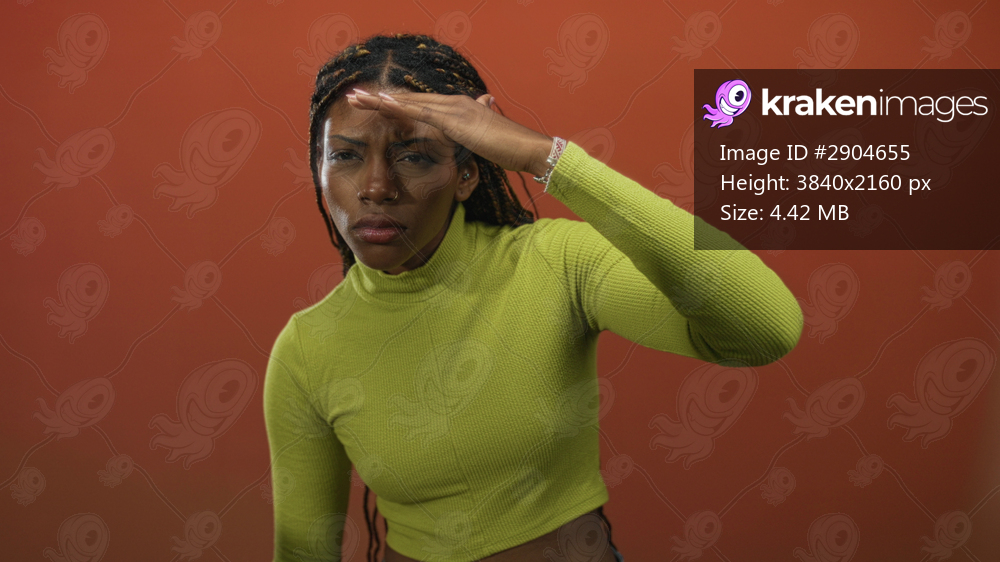 Woman with braided hair, face frowning and hand slightly raised in studio against burnt orange backdrop wearing lime green crop top; annoyance.