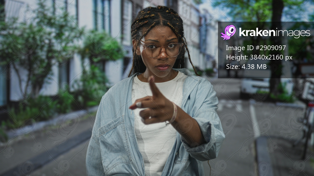 Woman with braided hair and glasses points finger to the right on street wearing denim shirt and white tee; hesitation concern.