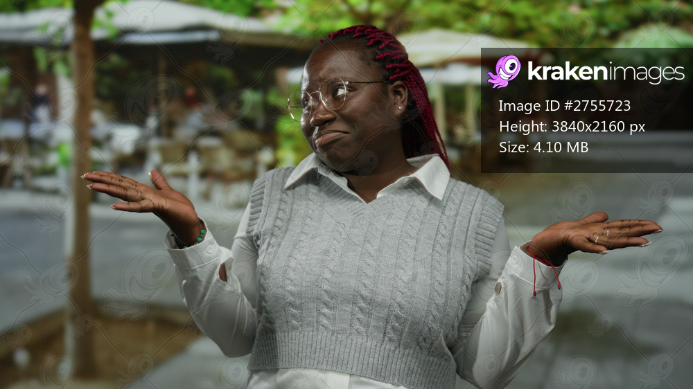 Woman with braided hair and glasses shrugs on outdoor terrace at city cafe, wearing grey sweater over white shirt, embodying casual expression in urban street setting. - Kraken Images