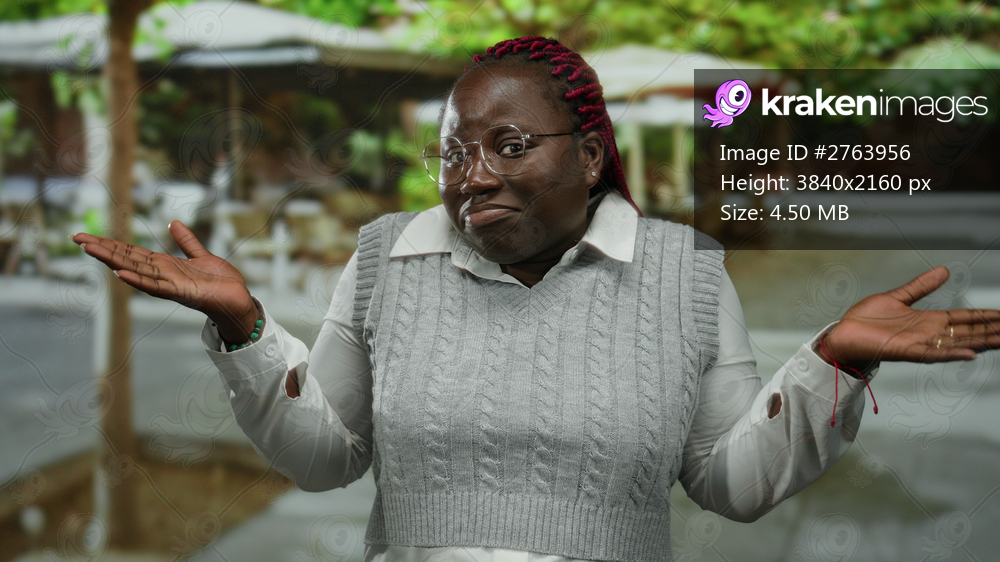 Woman with braided hair and glasses shrugs on outdoor terrace at city cafe, wearing grey sweater over white shirt, embodying casual expression in urban street setting. - Kraken Images