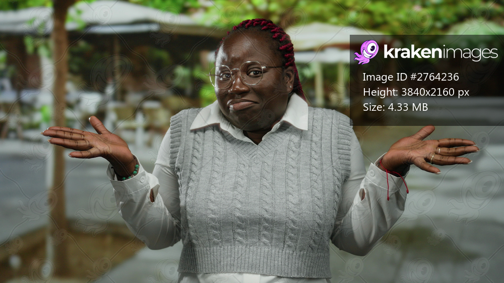 Woman with braided hair and glasses shrugs on outdoor terrace at city cafe, wearing grey sweater over white shirt, embodying casual expression in urban street setting. - Kraken Images