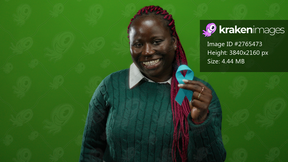 Woman with braided hair holding blue ribbon against isolated green background smiling.