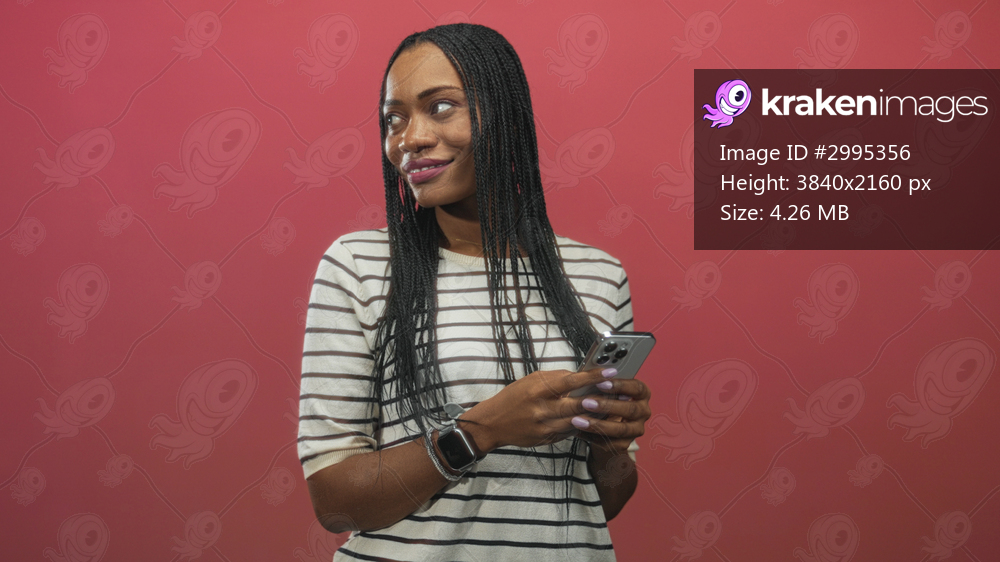 Woman with braided hair in striped shirt holds smartphone with hands, wears smartwatch and looks sideways in studio; quiet curiosity calm.