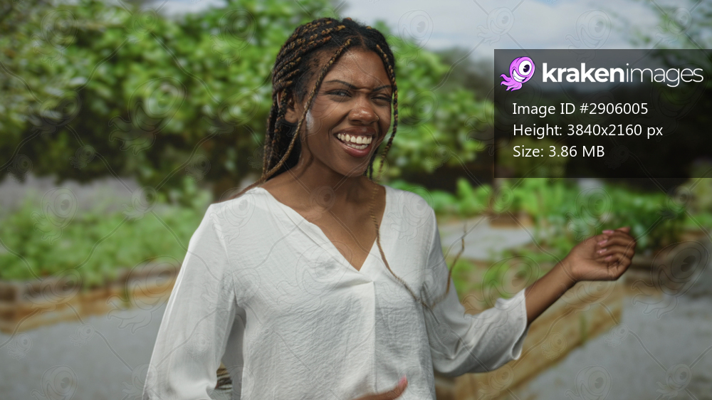 Woman with braided hair laughing, hand raised and dancing in a green forest garden outdoors near raised beds; happiness playful.