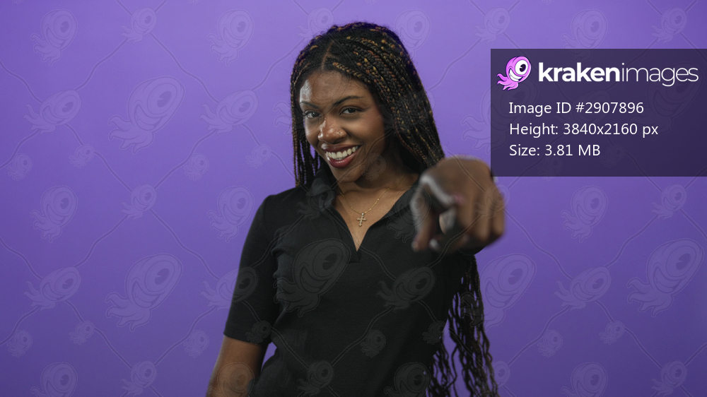 Woman with braided hair and nose ring points finger to camera in purple studio wearing black polo shirt, smiling and winking; confidence.