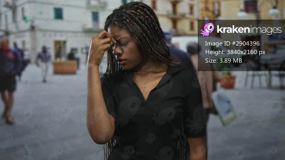Woman with braided hair pressing forehead with fingers while standing on a busy street near buildings and a white van; stress headache.