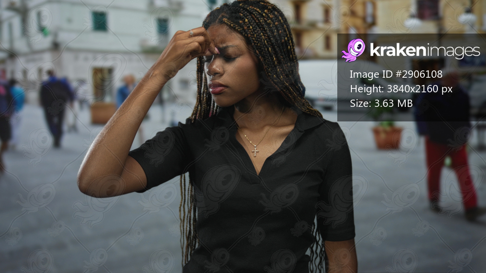 Woman with braided hair pressing forehead with fingers while standing on a busy street near buildings and a white van; stress headache.