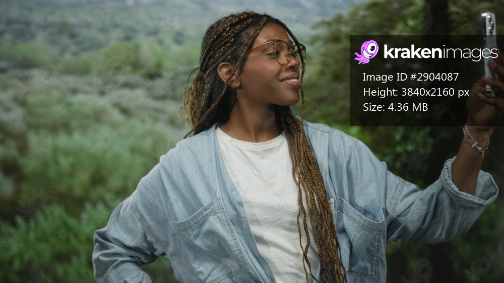 Woman with braided hair and round glasses adjusts glasses while holding smartphone and posing in forest field; confidence self reflection.