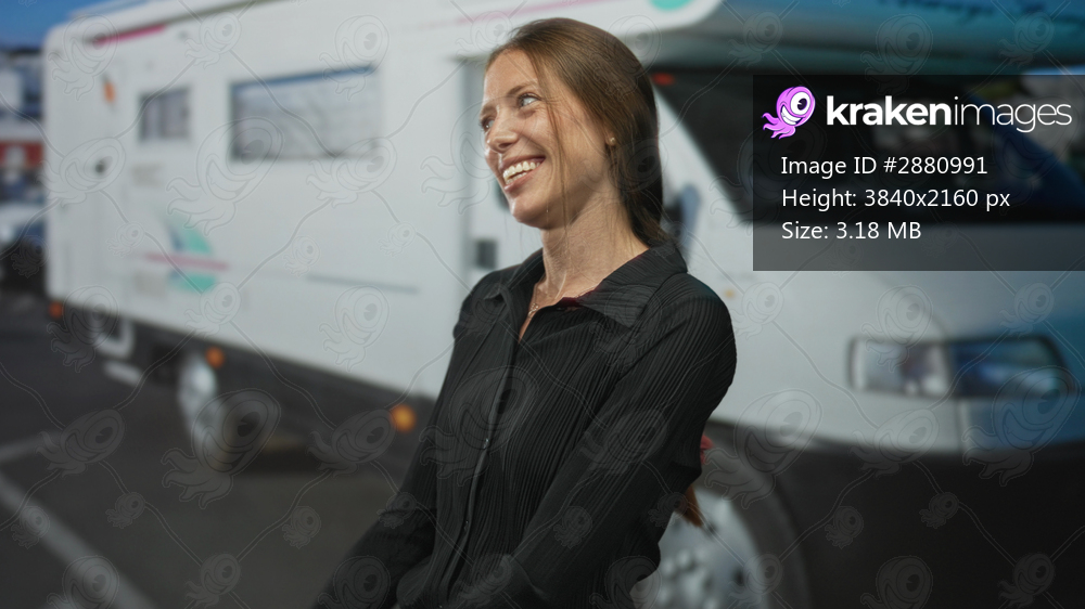 Woman with braided hair smiles and points finger while standing on street beside white camper van, showing hands and side profile; road trip joy.