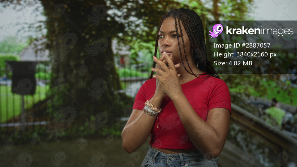 Woman with braided hair wearing a red crop top and bracelets holds hands clasped to chest near a large tree in a forest; anxiety reflection uncertainty. - Kraken Images