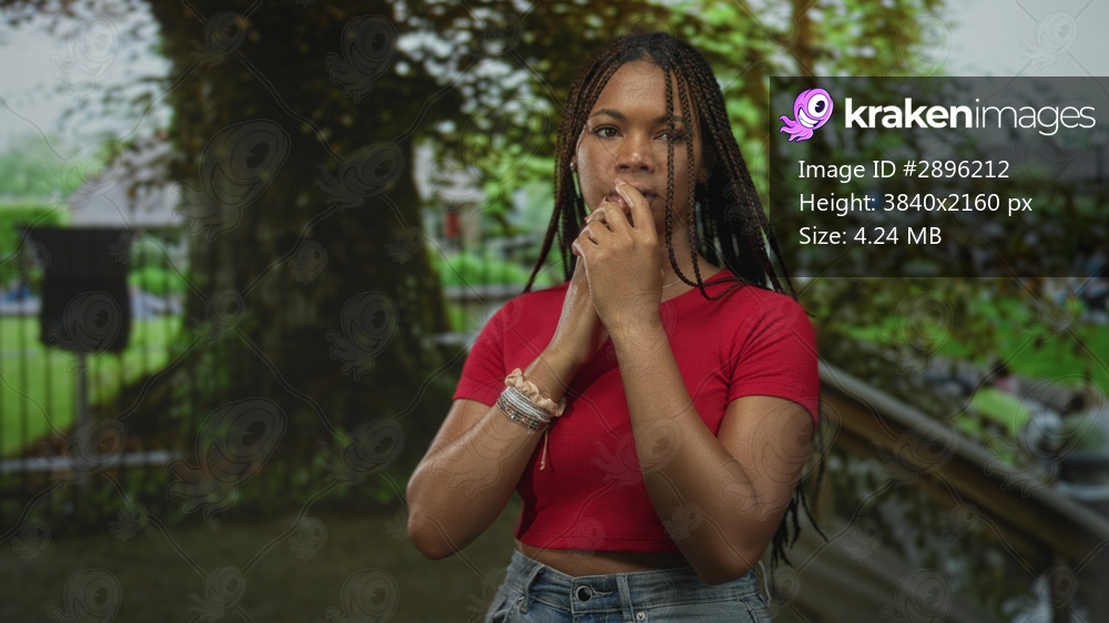 Woman with braided hair wearing a red crop top and bracelets holds hands clasped to chest near a large tree in a forest; anxiety reflection uncertainty. - Kraken Images