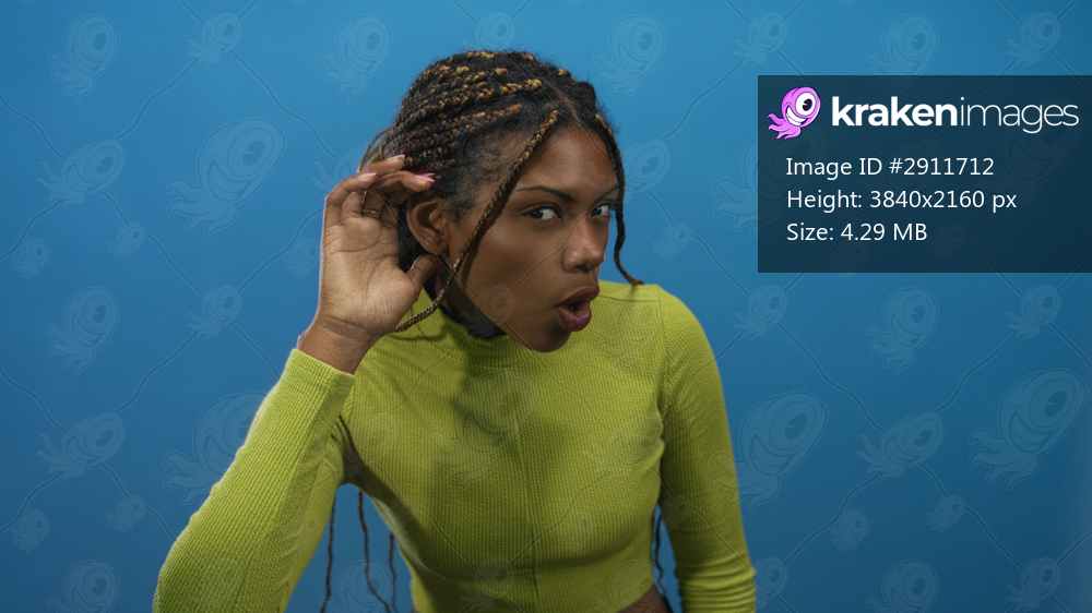Woman with braided hair wearing lime green crop top holding hand to ear and leaning forward in studio against blue backdrop; curiosity.