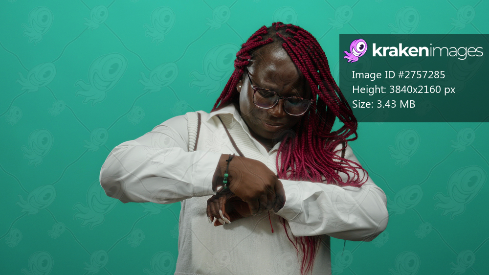 Woman with braids and glasses clutches her wrist in discomfort against an isolated green wall background, expressing pain in her wrist area.