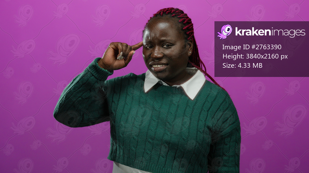Woman with braids makes confused gesture against isolated pink background wearing green sweater conveying emotion and expression with fingers near temple. - Kraken Images