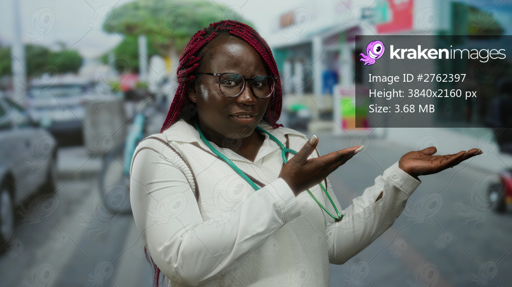 Woman with braids stands smiling wearing glasses and blouse holding hands outwards on a bustling city street background.