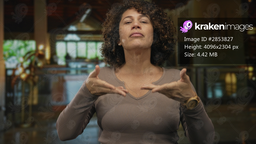 Woman breathing slowly with hands raised at chest level in hotel building, facing camera and performing inhalation exercises; breathwork calm.