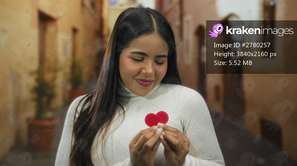 Woman with broken heart in hands stands in an outdoor old town street, embodying themes of love, emotion, and cultural heritage.
