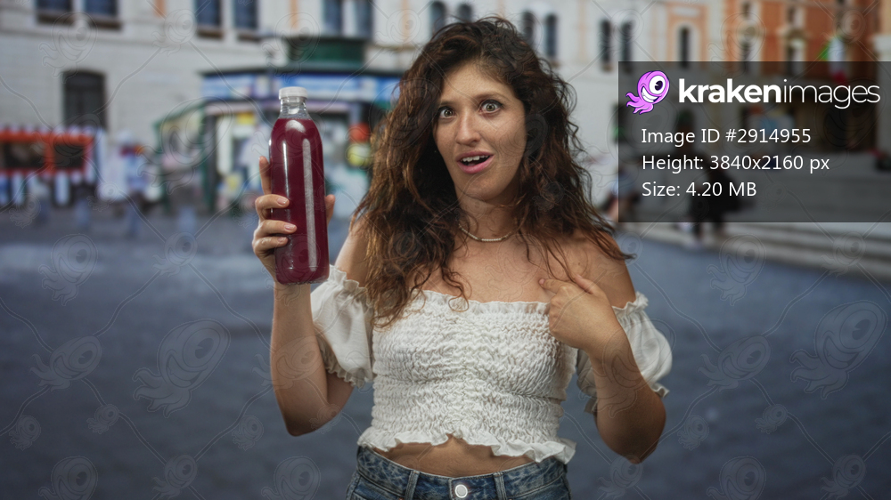 Woman with brown curly hair holding a tall juice bottle and pointing to bare shoulder on a busy city street; surprise.